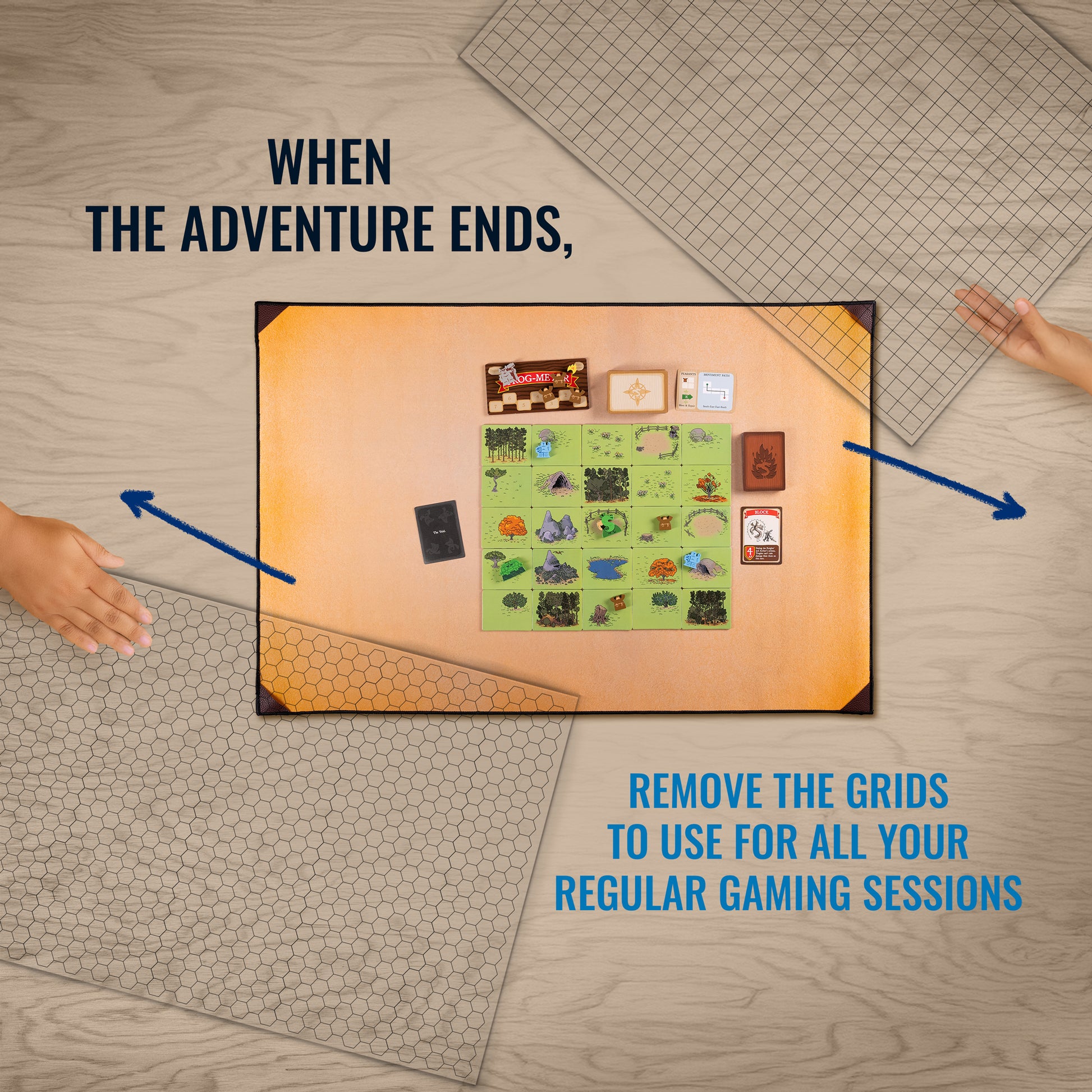 - Your Everyday Game Mat Playing Surface: When you aren't in need of D&D terrain maps, remove the grids from the neoprene tabletop surface so it can be used as your regular card game, board game and TTRPG playmat.