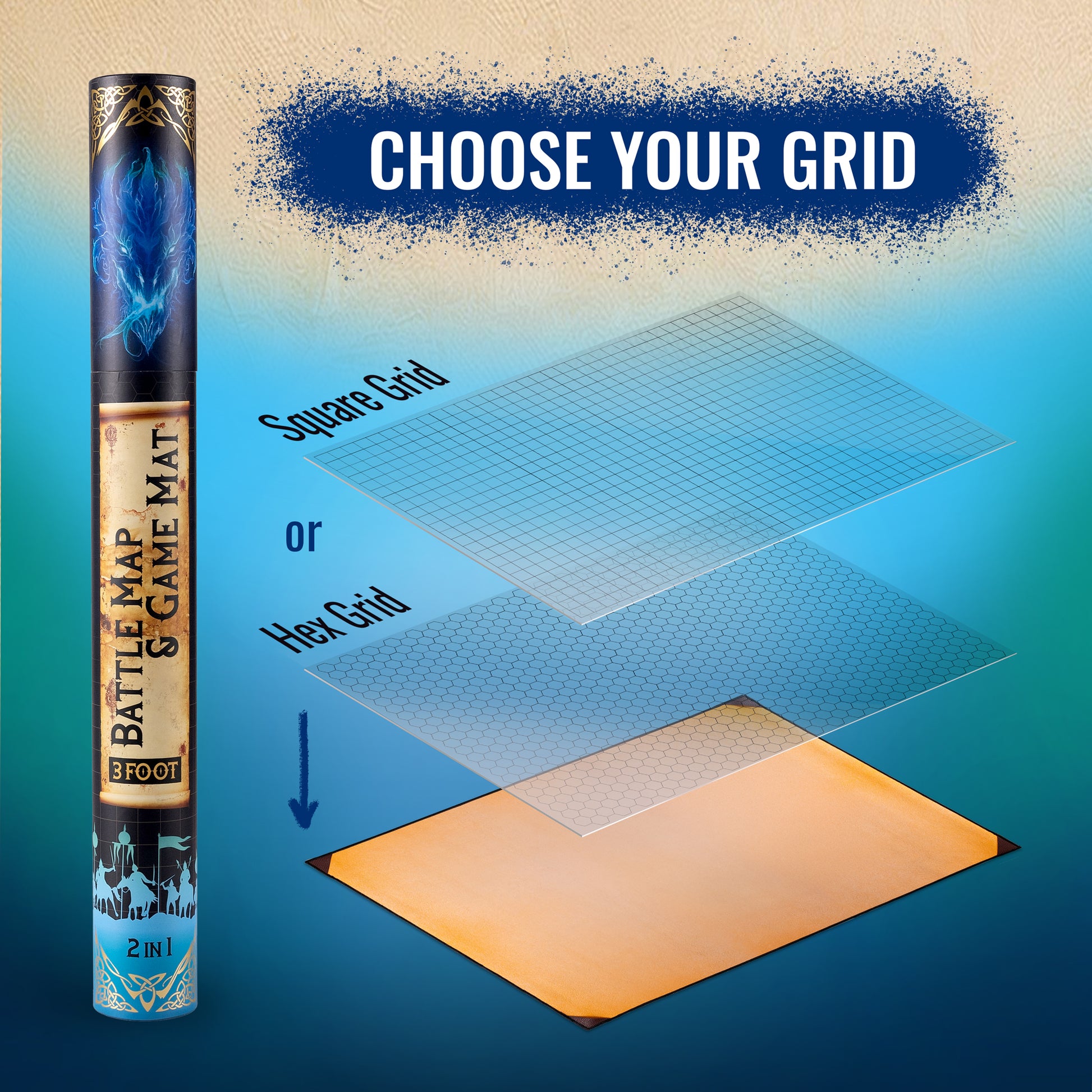 Bring your tabletop adventures to life with the ultimate reusable battle map system. This 3-foot neoprene game mat lays perfectly flat for every session and includes two clear overlays: one with a 1-inch square grid and one with a 1-inch hex grid which lets you switch between D&D, Pathfinder, and other RPGs in seconds. Use it plain for board games, or layer artwork underneath the transparent grids to create custom terrains. The non-slip neoprene surface resists creases, rolls for easy storage, and transforms any table into an immersive game space. Designed for Dungeon Masters and miniature gamers who want flexibility, premium quality, and creative freedom in one setup.