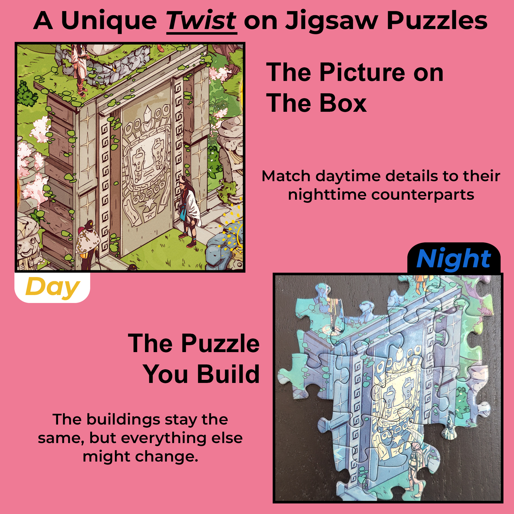 A Unique Challenge for Puzzle Lovers: What you see on the box, isn't what you build with the puzzle. The box image shows the scene during the daytime and your puzzle challenge is to construct the scene during the night. Use landmarks, buildings, and scenery as clues on how to put your puzzle together.